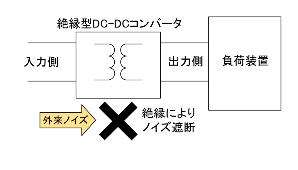 絶縁型DC/DCコンバータは1次/2次間の絶縁により、入力側からのコモンモードノイズが出力側へ伝わるのを抑える働きがあります。 (図1)