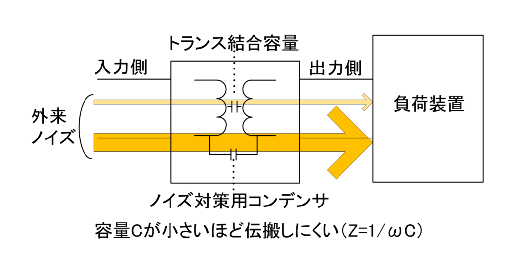 図4のノイズ対策用入力/出力間コンデンサを内蔵したコンバータの場合は1次/2次間容量が数百~数千pFとなりますので外来ノイズの伝搬する量が増大します。 (図2太い矢印)