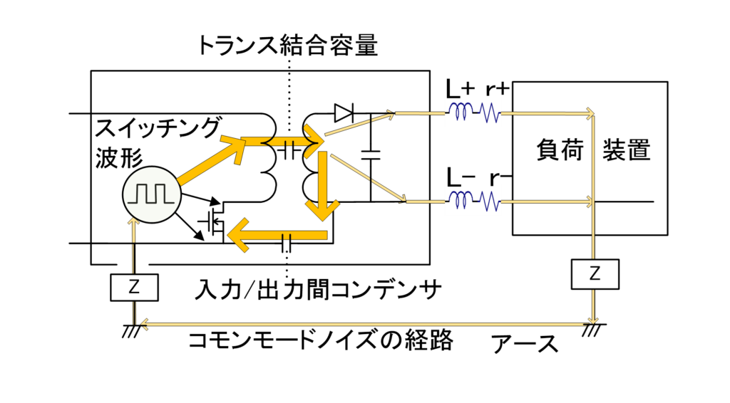 但し、実際のコンバータではトランスの1次/2次間結合容量(数十~数百pF)を通して外来ノイズが伝搬します (図2細い矢印)。
